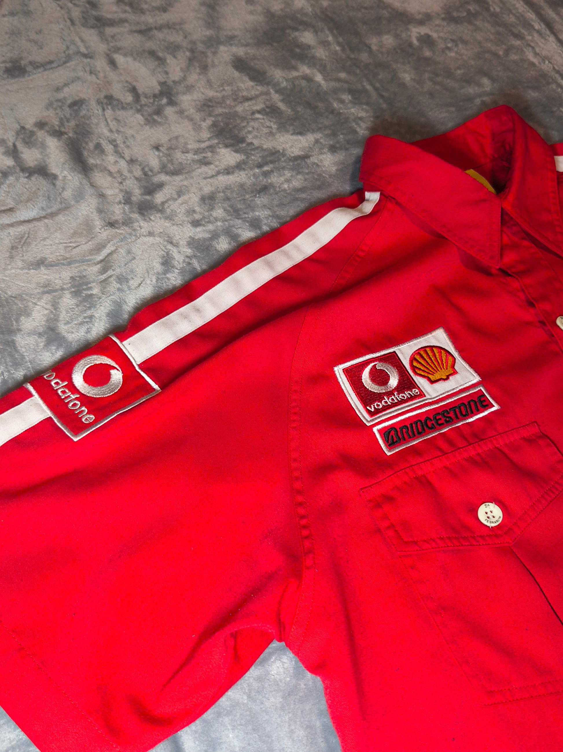 Dieses seltene Vintage-Stück im klassischen Formula-1-Racing-Look besticht durch echte Sponsor-Patches (Ferrari, Shell, Vodafone, Bridgestone, Marlboro) und den typischen Pit-Crew-Style.