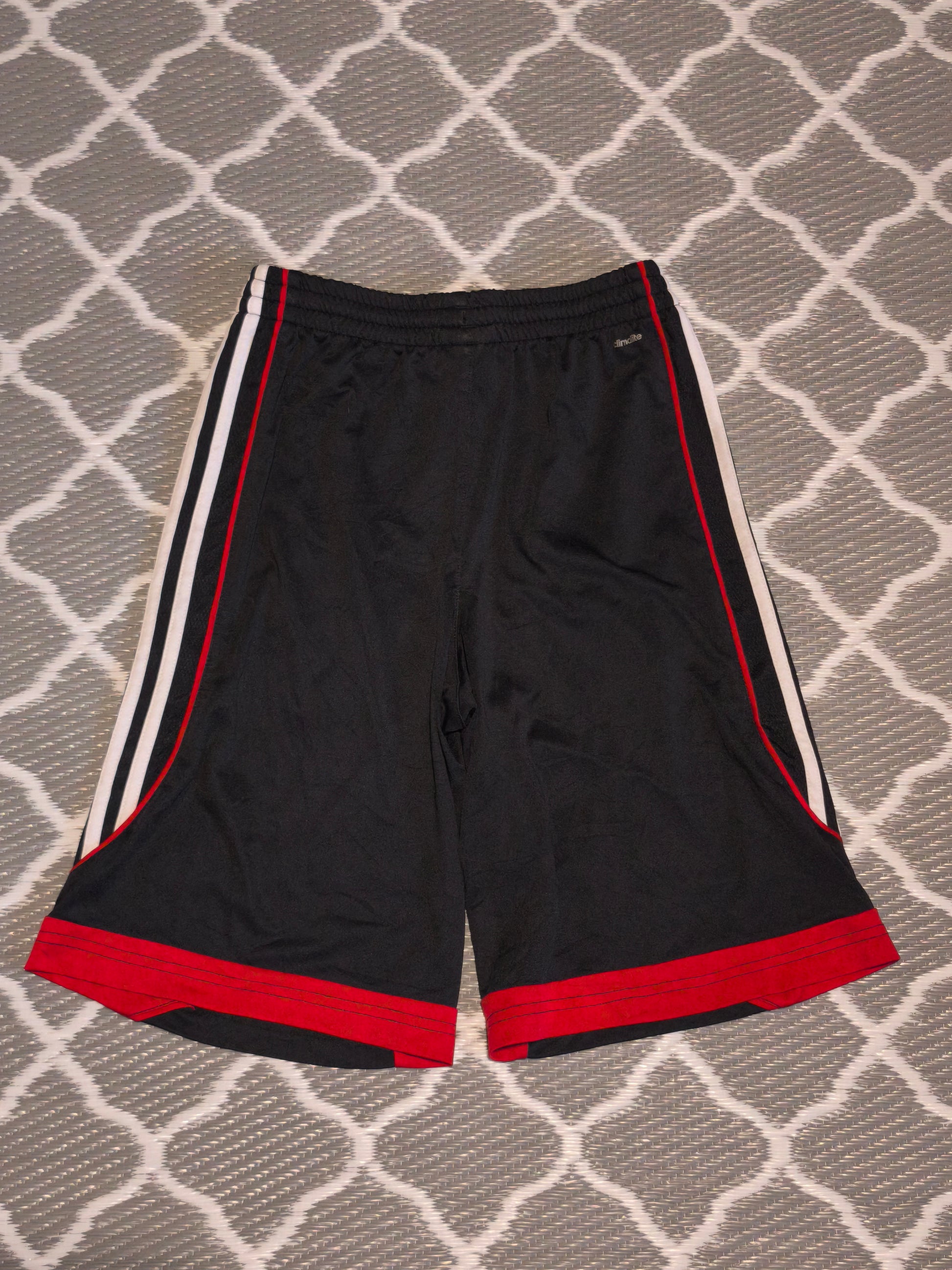 Schwarze Adidas Shorts mit klassischen 3-Streifen an den Seiten und roten Akzenten am Saum. Elastischer Bund für bequemen Sitz. Ideal für Sport, Schule oder Freizeit.